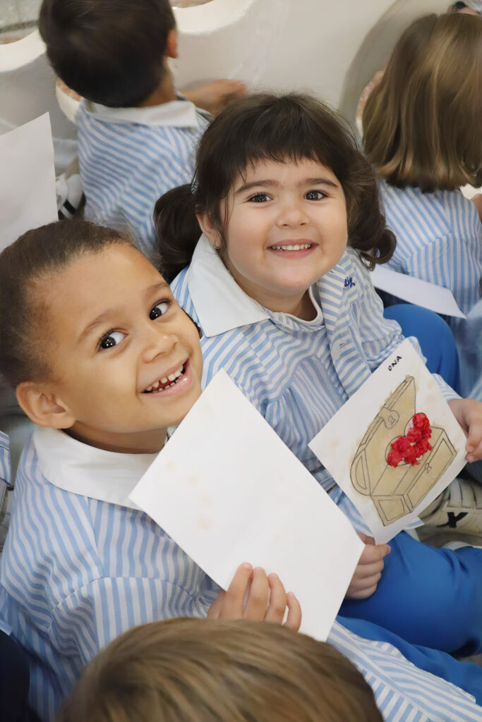 Des d’Infantil ens apropem a la seva figura tot observant la seva mirada serena i acollidora. També ens fixem en els elements que l’envolten i en el que representen: els llibres, el treball, la natura… Tots ells ens parlen dels valors que volem transmetre als infants.