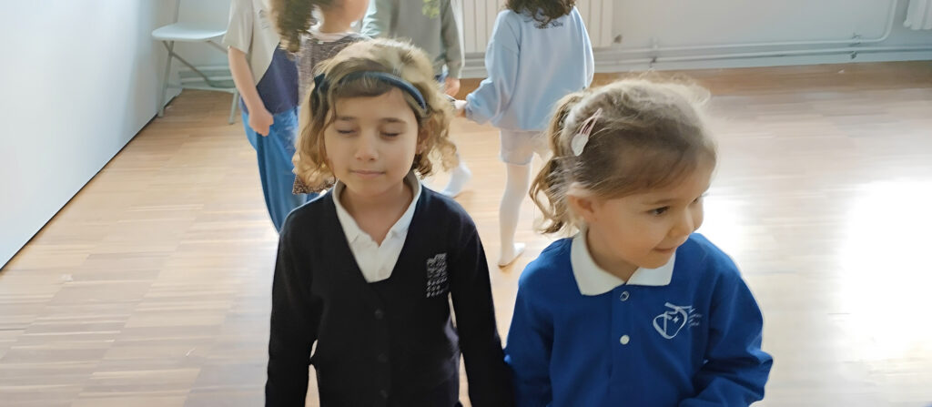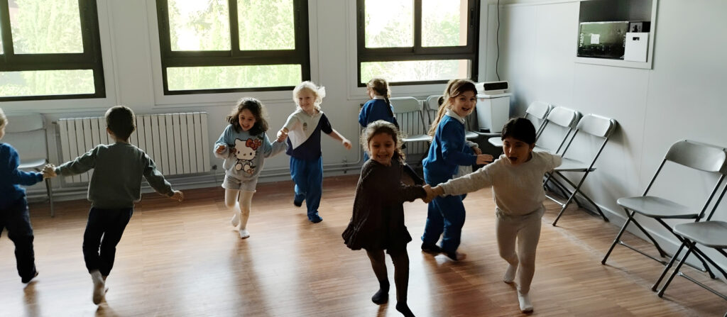 Cuando nuestros pequeños entran en el aula, se descalzan, se quitan la bata y comenzamos a jugar a alguna actividad que implique concentración, expresión corporal o coordinación. Es la fase que llamamos de calentamiento y que nos garantiza la predisposición al juego.